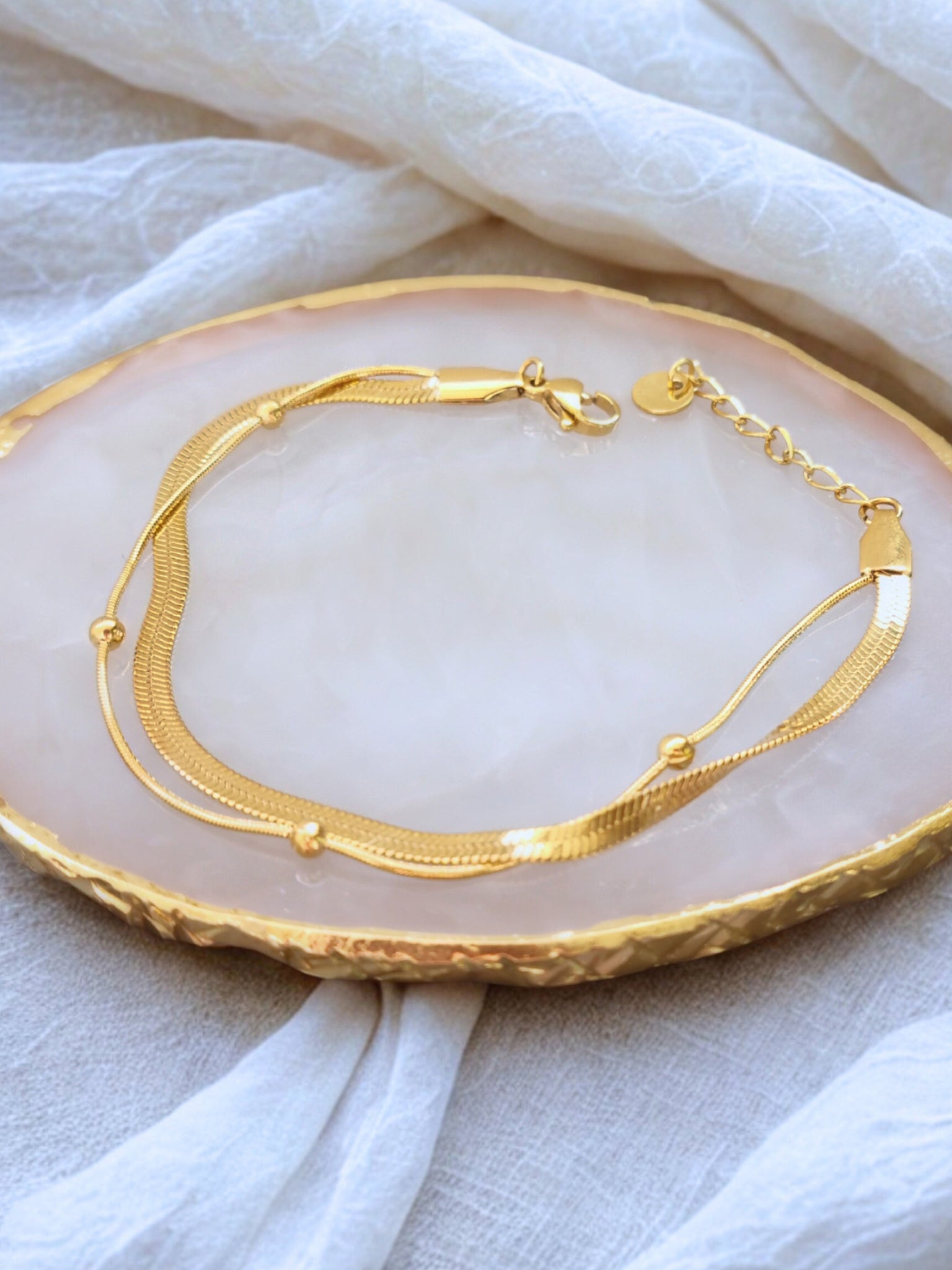 Le bracelet Marina séduit par son design en double chaîne en acier inoxydable, délicatement entrelacé pour un rendu chic et contemporain. Une première chaîne ornée de fines billes et une seconde à maillons resserrés captent la lumière avec subtilité. Léger et ajustable, il se porte seul pour une touche raffinée ou mixé à d’autres bracelets pour un look plus affirmé.