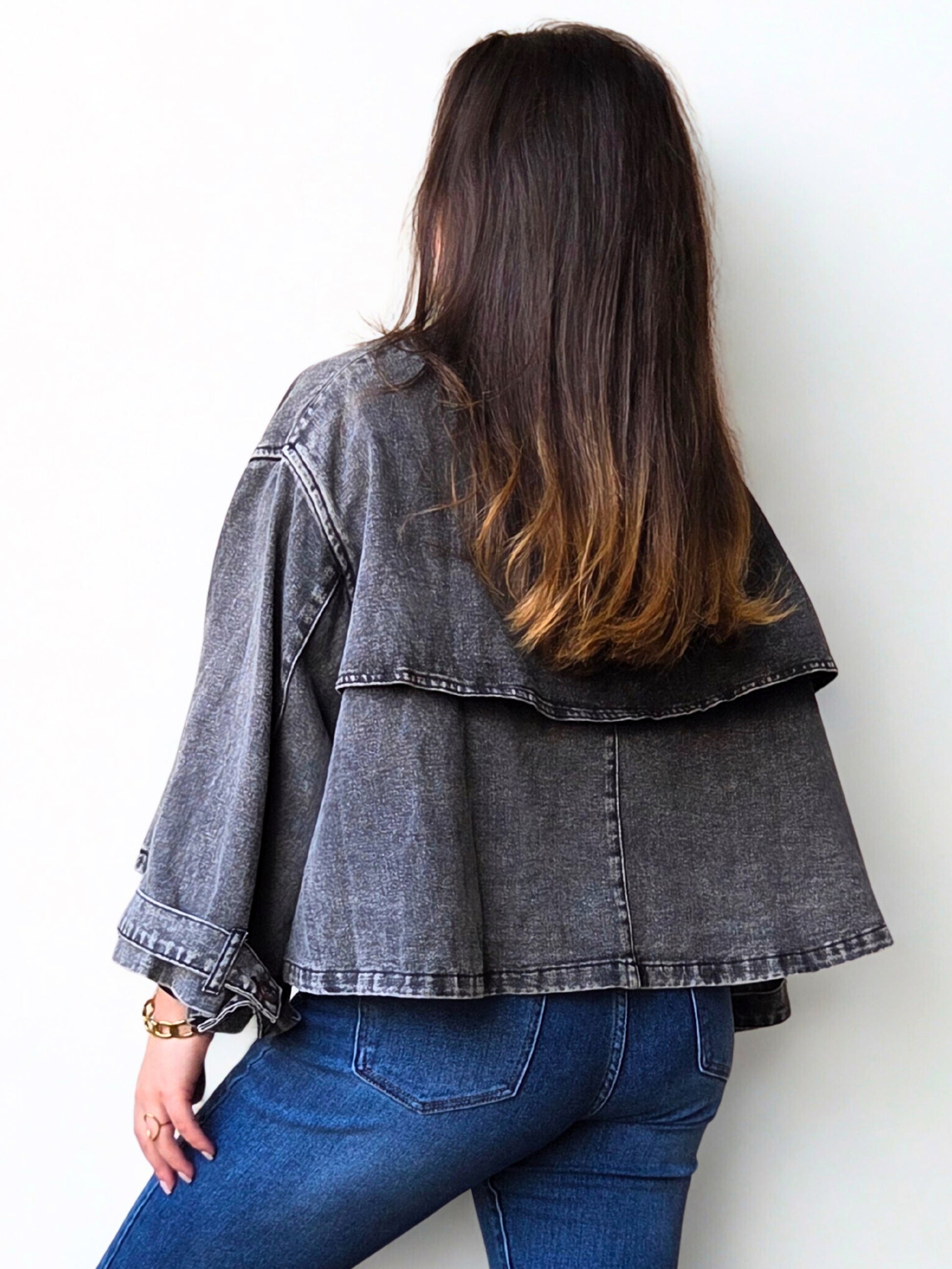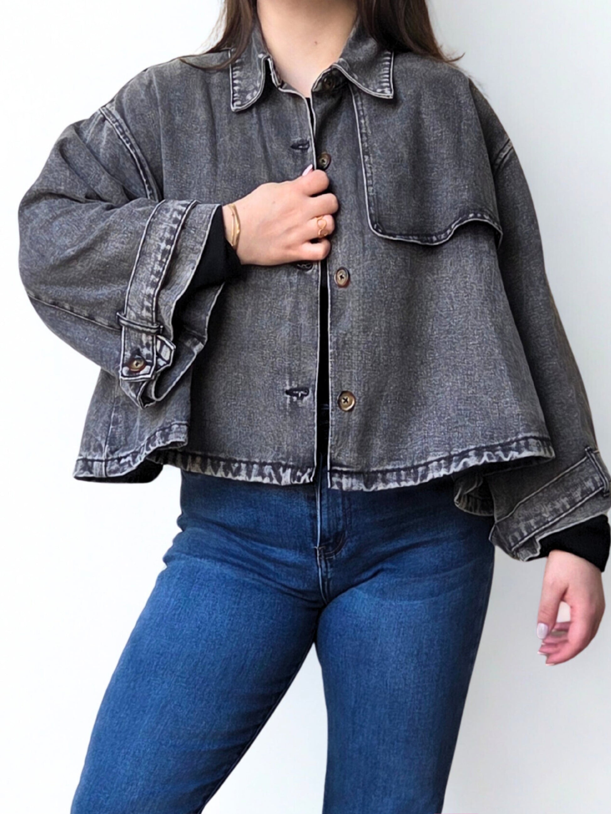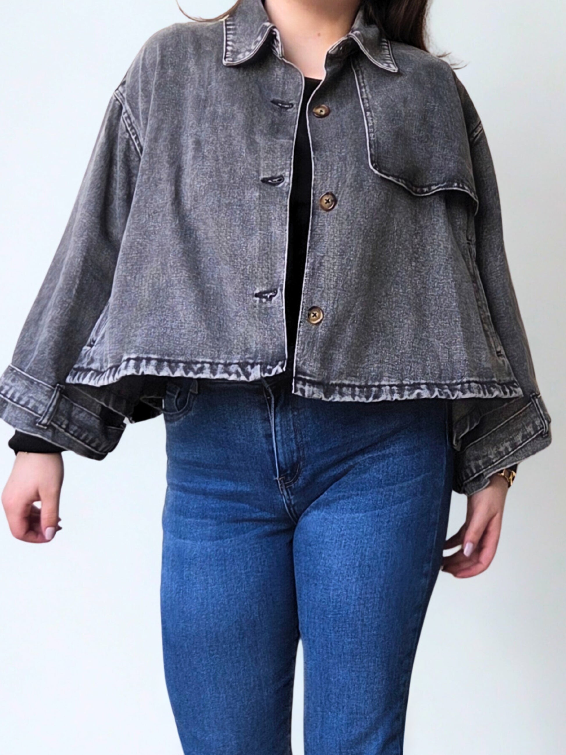 La veste en jean Inès revisite un classique avec un style cape ultra tendance et affirmé. Sa coupe ample et structurée apporte une allure moderne tout en restant facile à porter. Confectionnée dans un jean gris délavé, elle se distingue par son volume travaillé, ses manches larges et son boutonnage frontal qui lui donnent du caractère. À la fois confortable et stylée, elle se porte aussi bien sur un look casual que pour casser une silhouette plus habillée.