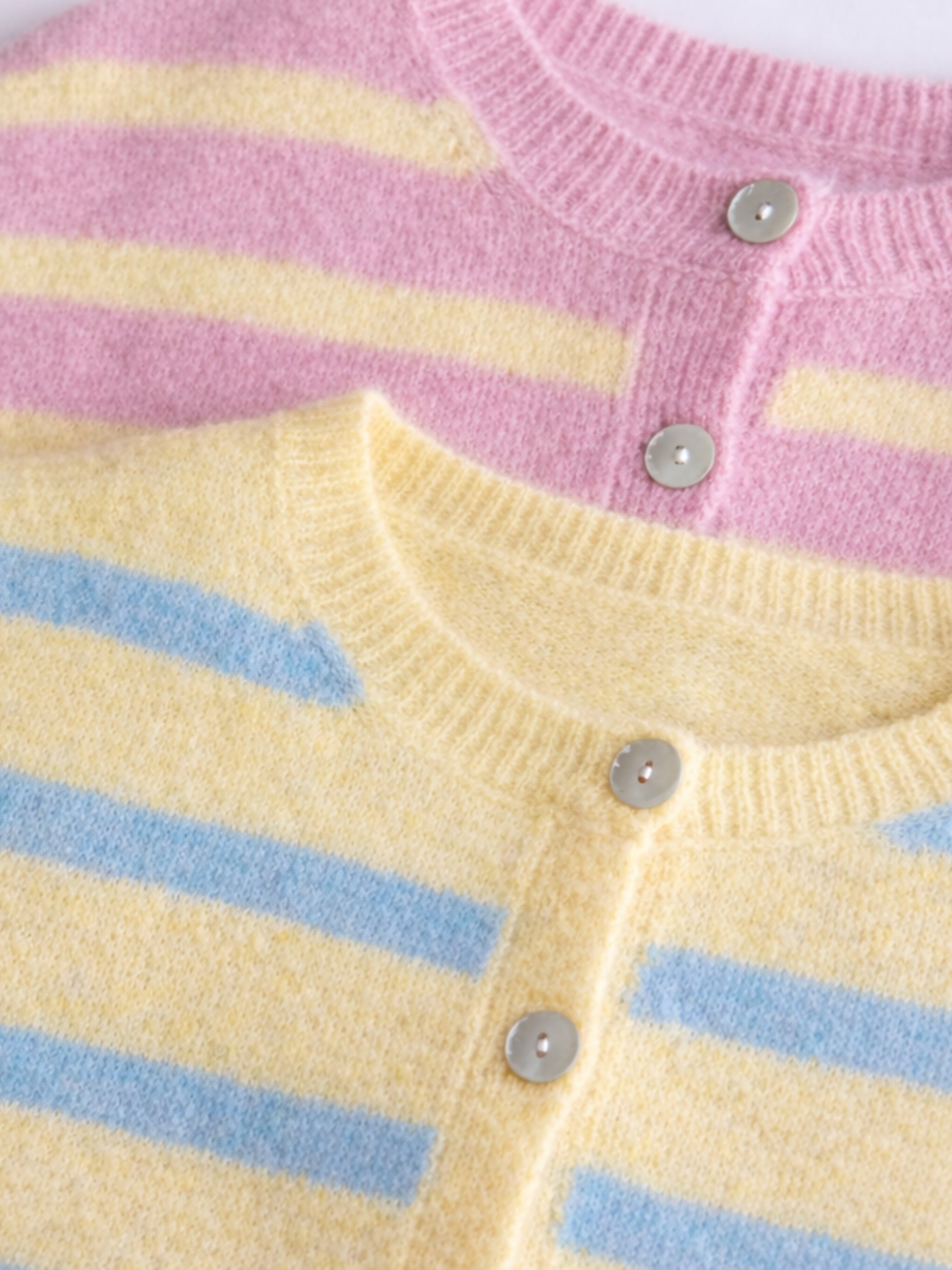 Le gilet Aria séduit par sa maille douce et moelleuse aux rayures jaune et bleu pastel, idéale pour illuminer vos looks de printemps. Sans manches et boutonné sur le devant, il se porte aussi bien seul avec un jean que superposé sur une blouse ou une robe. Confectionné en Italie, il offre un tombé confortable et une allure à la fois fraîche et tendance. Un indispensable pour apporter une touche colorée et stylée à vos tenues printanières.