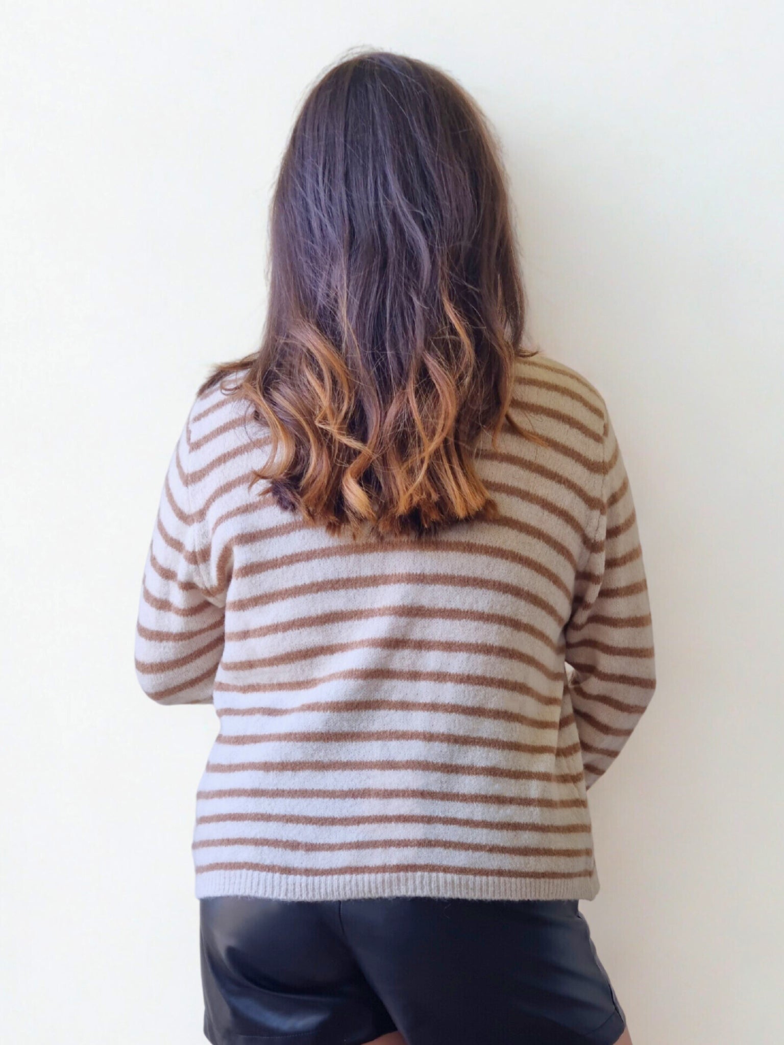 Le gilet Sidonie séduit par sa maille douce et son motif rayé aux tons naturels qui traversent les saisons sans se démoder. Sa coupe droite et confortable, associée à son boutonnage nacré et son col rond, en fait une pièce facile à porter au quotidien. Idéal sur un jean, un short ou une jupe, il apporte une touche casual chic à vos looks d'automne et d'hiver.