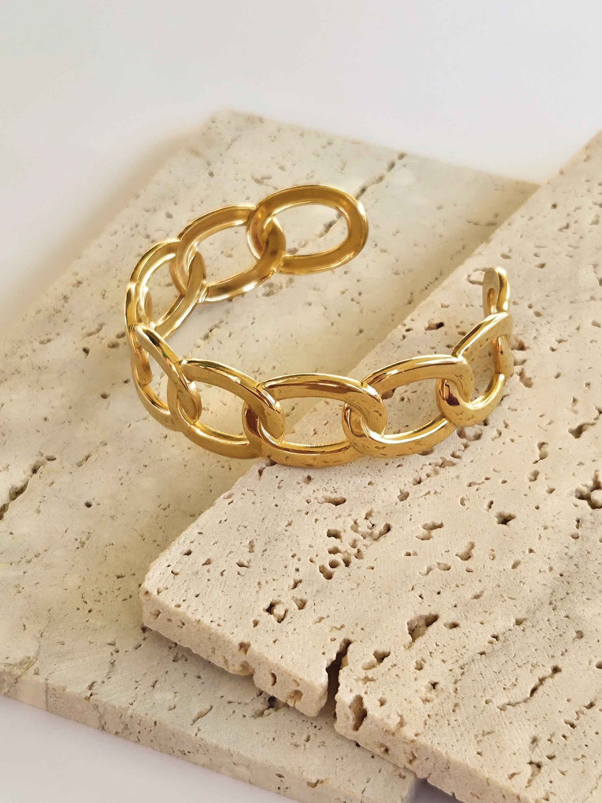 Le jonc Margaux doré séduit par son design moderne à gros maillons ajourés. Sa finition dorée lui confère une allure élégante et lumineuse, parfaite pour sublimer vos tenues du quotidien comme de soirée. Ce bijou rigide et ajustable, à la fois structuré et tendance, se porte seul pour une touche raffinée ou associé à d’autres bracelets pour un style plus affirmé.