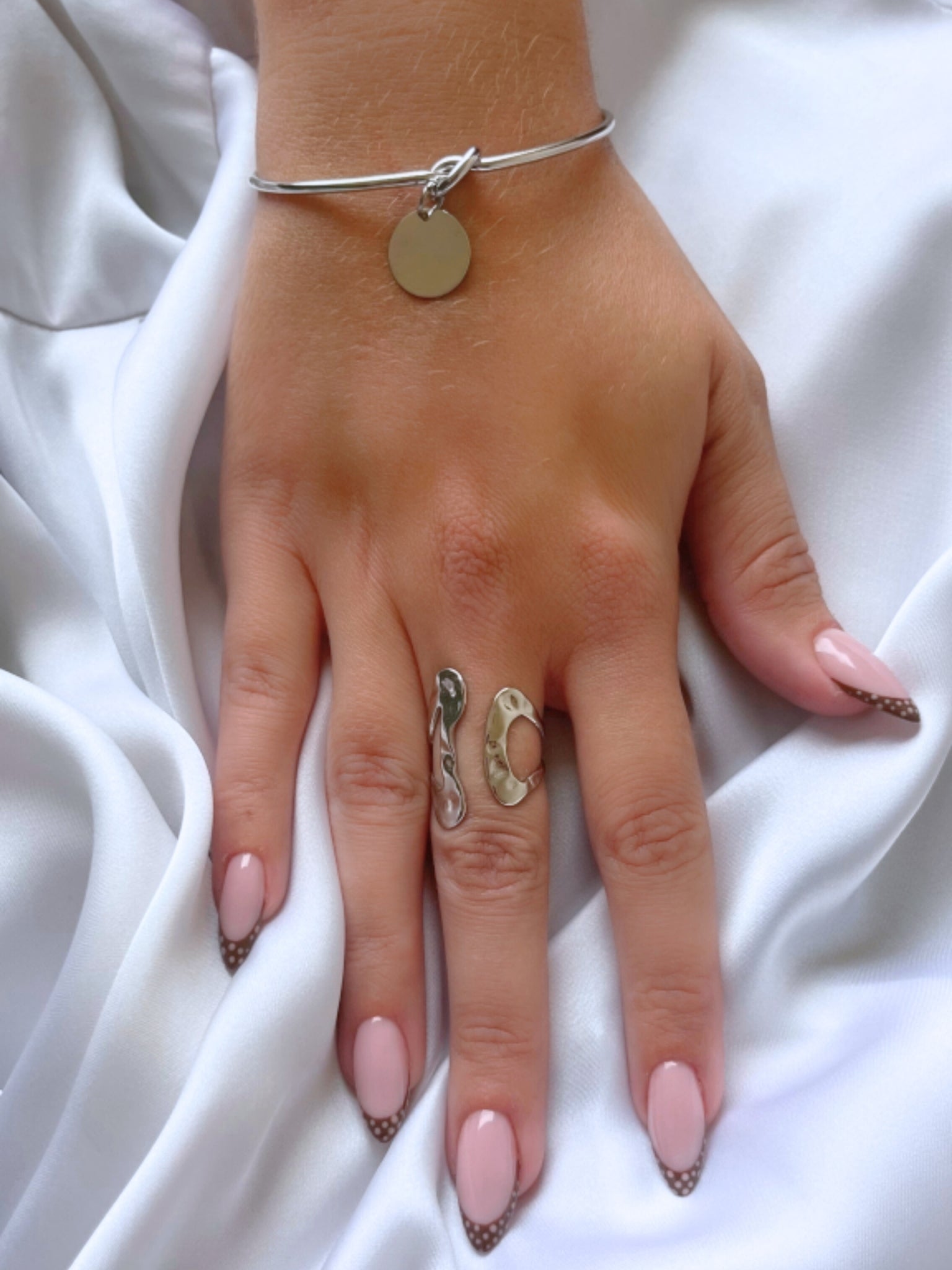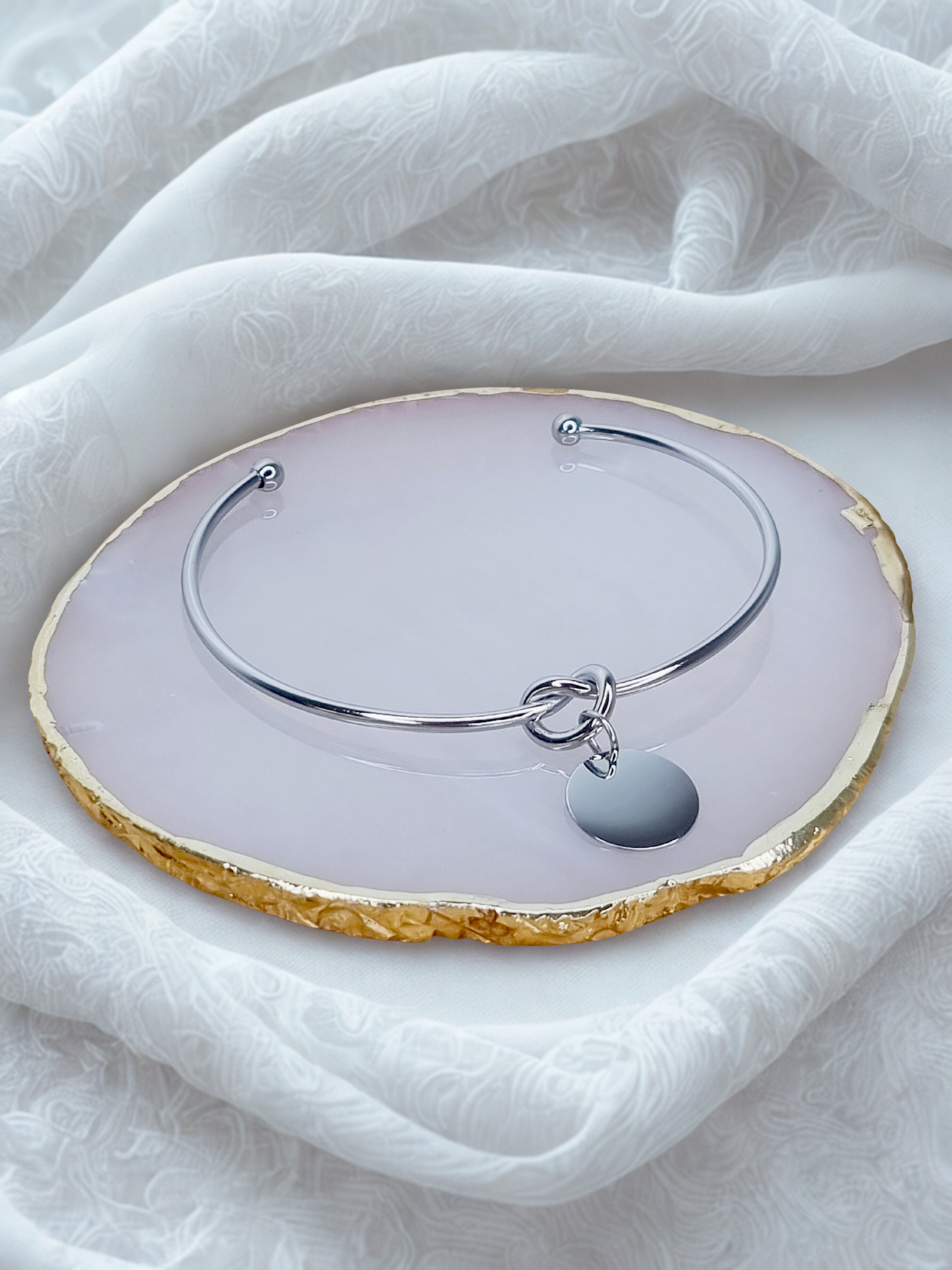 Le jonc Victoria mise sur une ligne épurée : un jonc rigide ouvert en acier inoxydable, orné d’un nœud central et d’une médaille pendante. Disponible en doré ou argenté, il apporte une touche chic et lumineuse au poignet. À porter seul pour la finesse ou en accumulation pour un look plus affirmé.