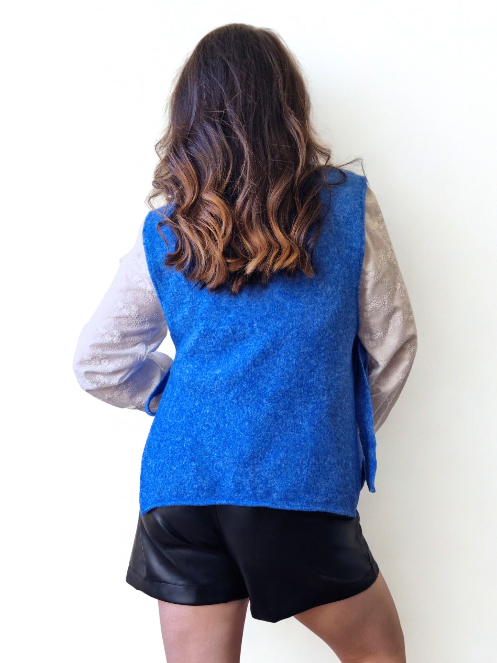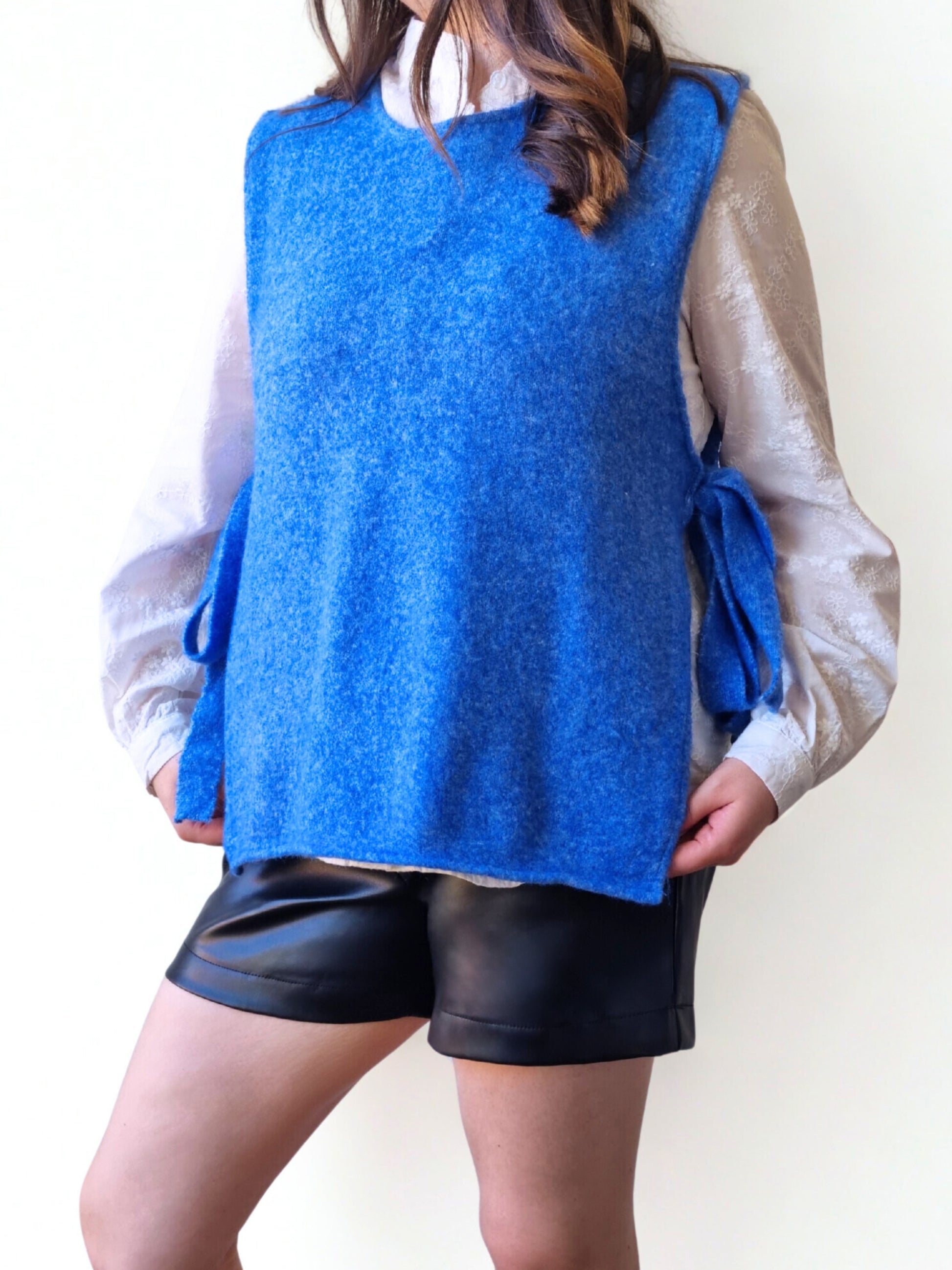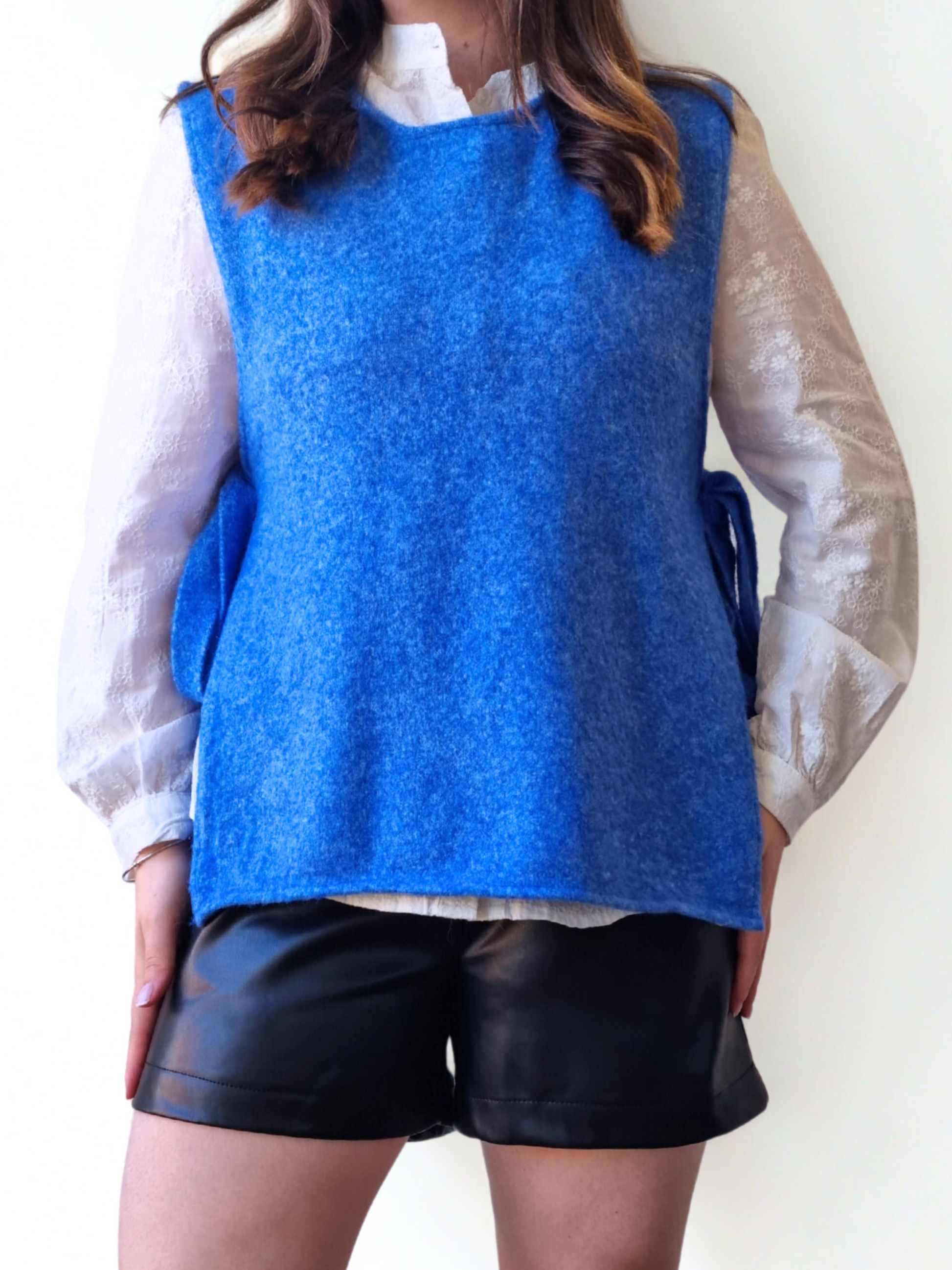 Le pull sans manches Tina se démarque par sa coupe moderne et ajustable à toutes les morphologies grâce à ses liens noués sur les côtés. Il allie confort et tendance en superposition sur une chemise ou un sous-pull pour des looks de mi-saison ultra stylé.