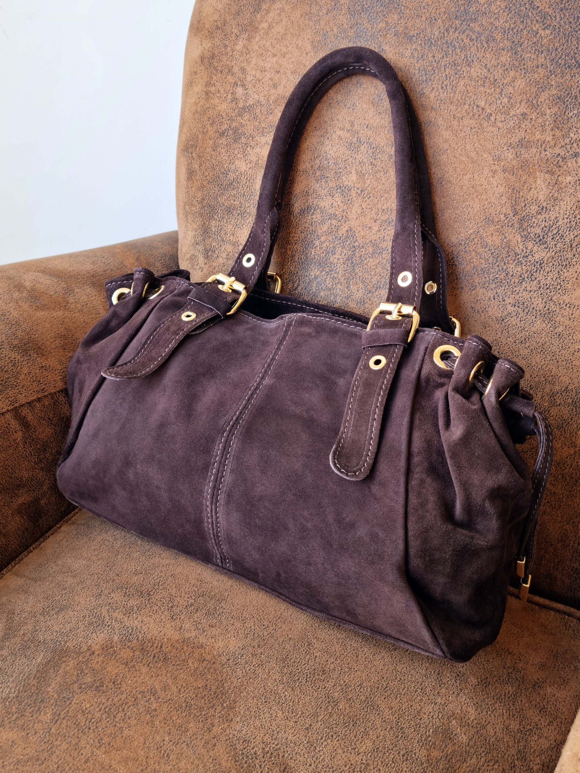 Le sac Déva, en croûte de cuir 100 % made in Italy, séduit par sa forme souple et tendance. Il dispose d’une grande poche principale, d’une poche centrale zippée et d’une petite poche intérieure pour vos essentiels. À l’extérieur, une poche au dos offre un rangement pratique supplémentaire. Ses anses ajustables permettent un porté main ou épaule, tandis que la fermeture zippée sur le dessus assure sécurité et élégance. Disponible en chocolat ou camel, c’est le compagnon parfait pour la saison automne-hiver.